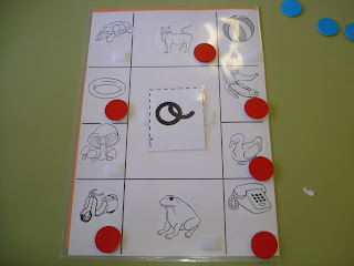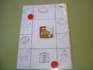 El niñ@ tiene que marcar el dibujo que empieza, termina o tiene esa determinada silaba; y lo hace colocando una ficha en la casilla correspondiente a la que tambíen le he puesto un velcro.