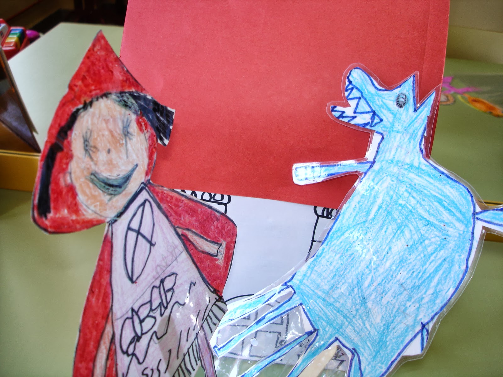 De mi paso por infantil guardo imágenes de los personajes de cuentos que los niños hicieron y que plastifique para hacer marionetas, los guardabamos en un libro gigante que estaba en la biblioteca y ellos podían representar los cuentos clásicos cuando querían. A veces mezclaban personajes de cuentos diferentes y hacíamos cuentos nuevos muy divertidos con un poco de Blancanieves y otro poco de Caperucita...