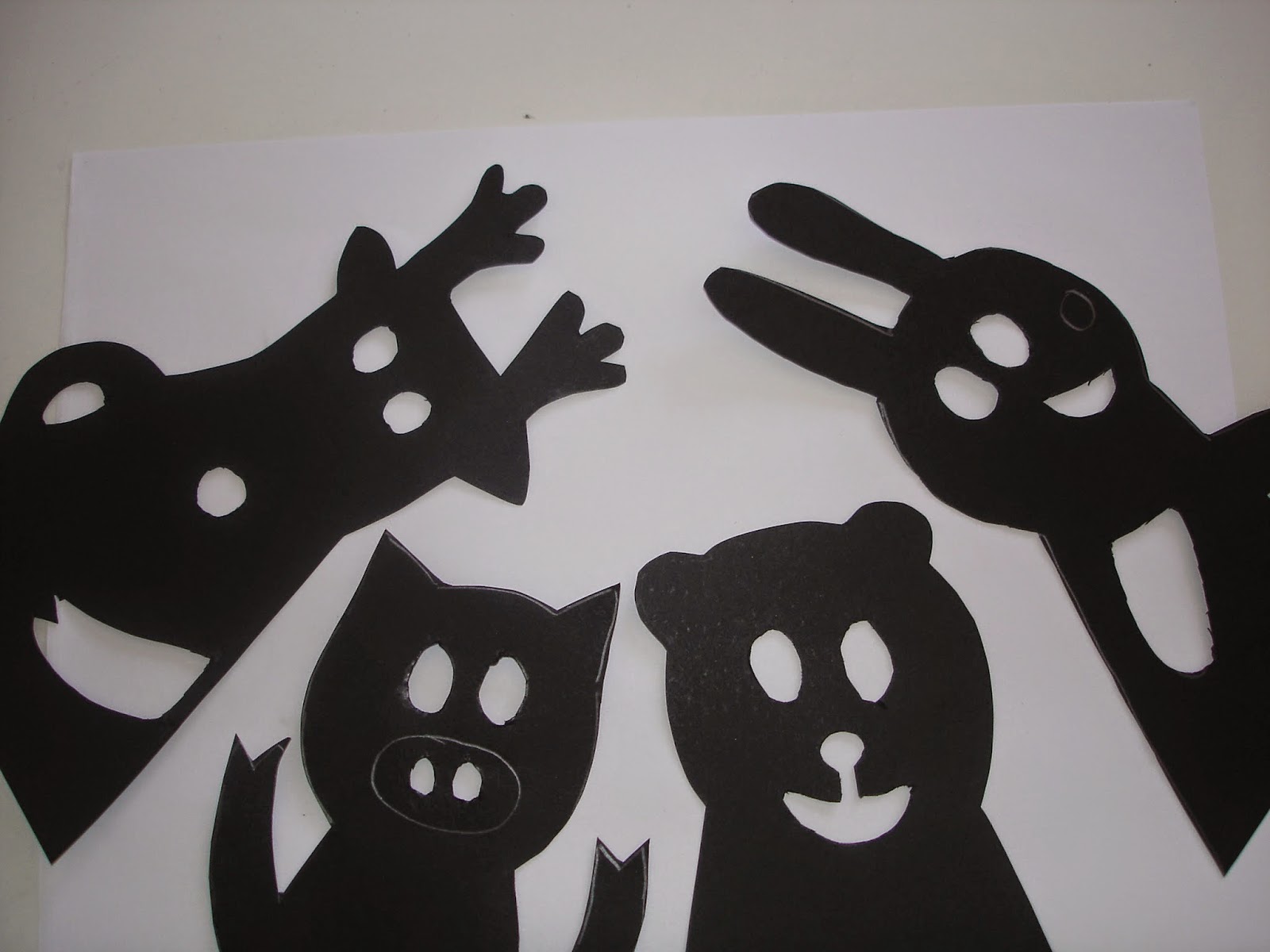 La presentación del cuento para mis alumnos la he hecho elaborando unas marionetas con la silueta de los animales en cartulina negra y lo he representado en un teatrillo de patas.